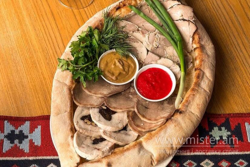 Соковита буженина, курячий рулет з чорносливом, ковбаса домашня, язик. Подаємо з гірчицею та хріном.