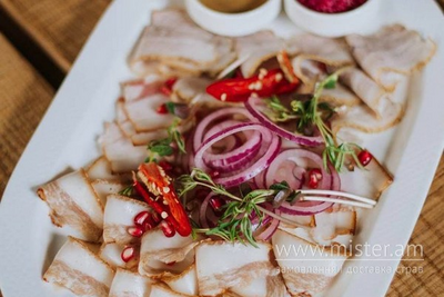Сало мариноване, підчеревок, сало копчене. Подається з хроном та гірчицею. Прикрашається: червоною цибулею, зернами гранату та перцем чилі.