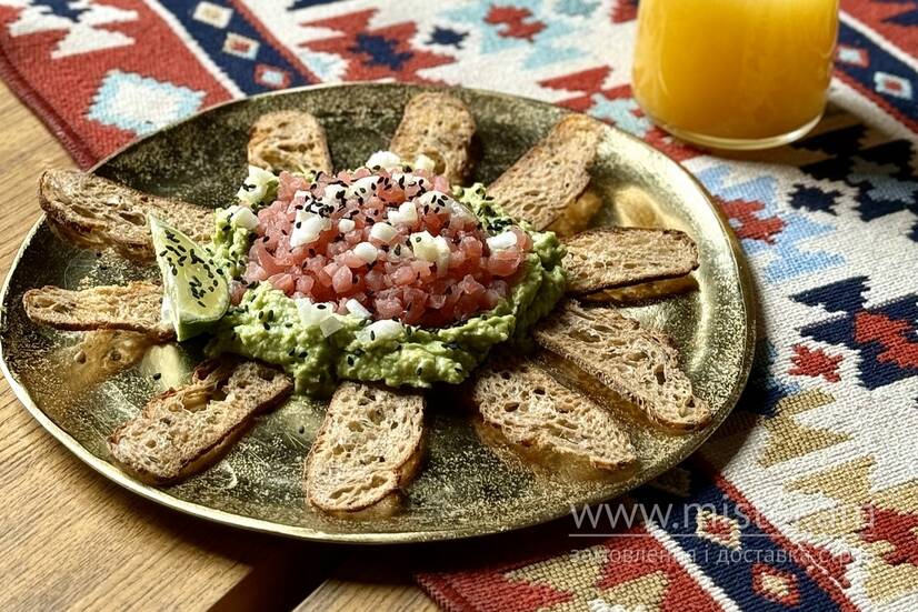 Свіжий рублений тунець на подушці з авокадо. Неймовірного смаку додають шматочки зеленого яблука та лайм.