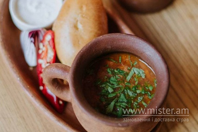 Подається з соусом мацоні, хлібом Пурі, копченою грушею, червоною цибулею та перцем чілі. Прикрашається петрушкою.