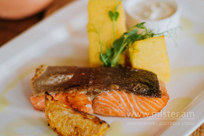 Салобіє Стейк з лосося з запеченою полентою та соусом Тар-тар