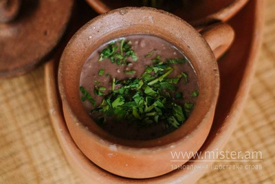 Квасоля червона відварюється, додають цибулю часник, перець чилі, сіль, перекручений волоський горіх та спеції та тушкують. Потім перебивають в термоміксі. Подають з солоними огірками.