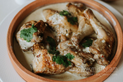 Шматочки курчати у вершковому соусі. Прикрашається перцем Чилі.