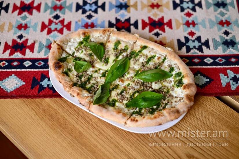 Тісто змащене соусом мацоні, з додаванням сиру сулугуні.. Після запікання поливається соусом песто та оливковою олією, додаються волоські горіхи, кінза та петрушка. Подається з соусом до хрустких бортиків.