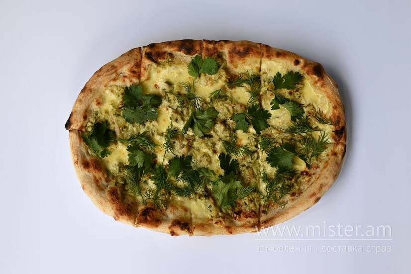Тісто змащується соусом мацоні, з додаванням пекаріно, сулугуні та циплям шкмерулі. Після запікання поливається часниковою олією. Прикрашається кінзою та укропом. Подається з соусом до хрустких бортиків.