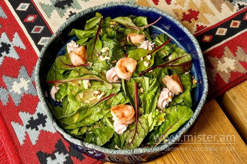 Соковиті креветки, обсмажені до золотої скоринки, поєднуються з крем-сиром, що дадає вершкової ніжності. Свіжа зелень дарує страві легкість та аромат.