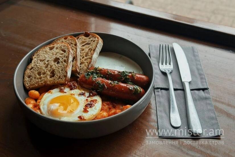 Сніданок з копченими сосиками, ніжною квасолею ясь у томатному соте, яєчнею, кріспі чилі та двома соусами - сирно-йогуртовим та чімічурі.Доповнює страву свіжоспечиний хліб на заквасці.