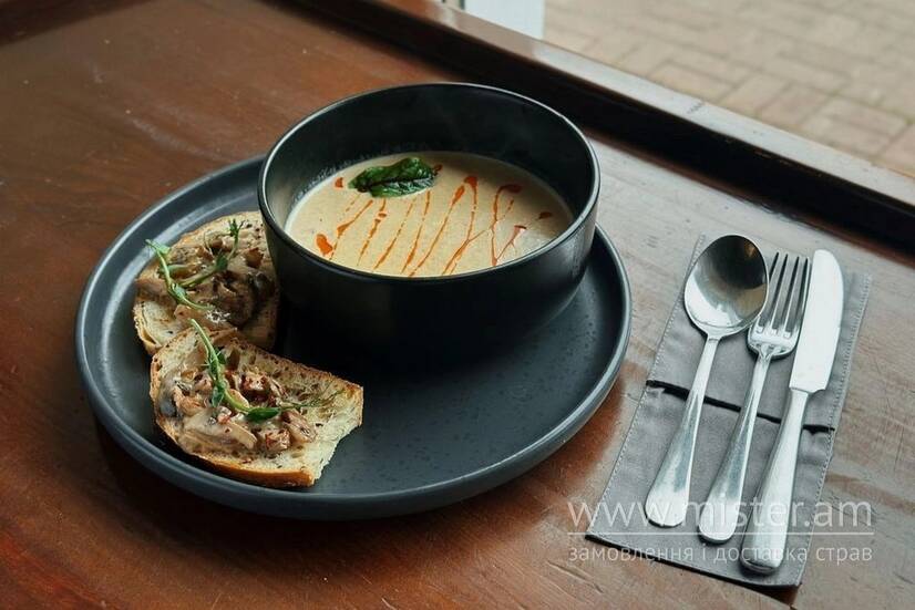 Крем-суп з білими грибами (білі гриби, печериці, ріпчата цибуля, часник, картопля, вершкове масло, курячий бульйон та вершки). Подається з двома гречаними грінками на заквасці, вершковим маслом та грибним соусом.