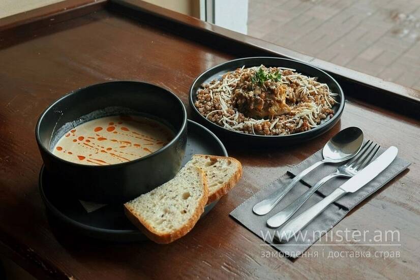 Ніжний крем-суп із білих грибів та з насиченим ароматом лісу. Також курячі котлети в грибному соусі, подані з розсипчастою гречкою, що добре підкреслює м’який смак страви. Ситний, теплий та легкий ланч, створений для комфортної паузи посеред дня.