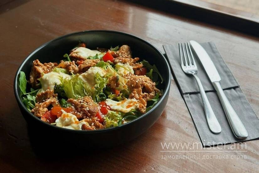 Теплий салат з яловичиною, овочами та яйцем пашот
