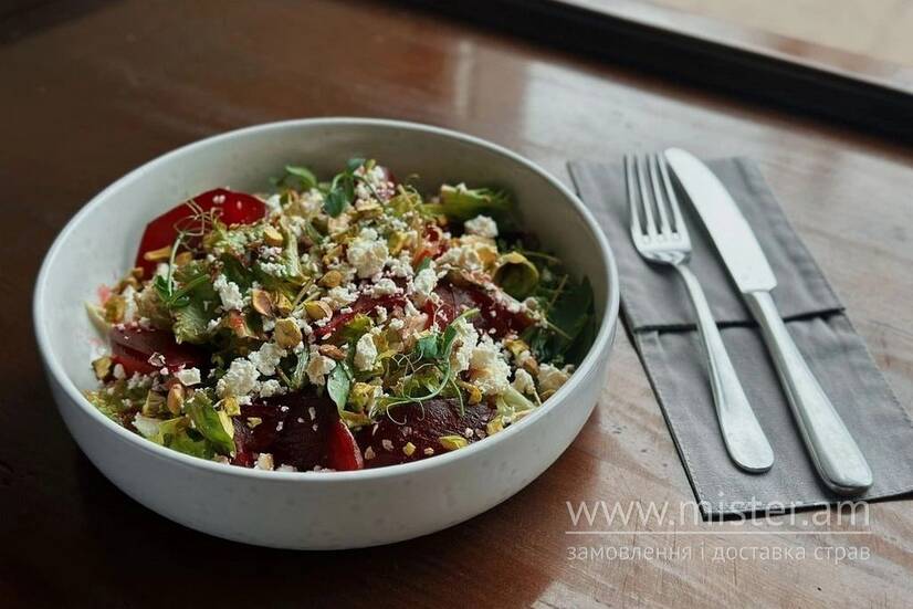 Соковитий мікс салату, помідори чері, заправлений малиновим вінегретом з запеченим маринованим буряком, копченою бринзою та смаженою фісташкою.