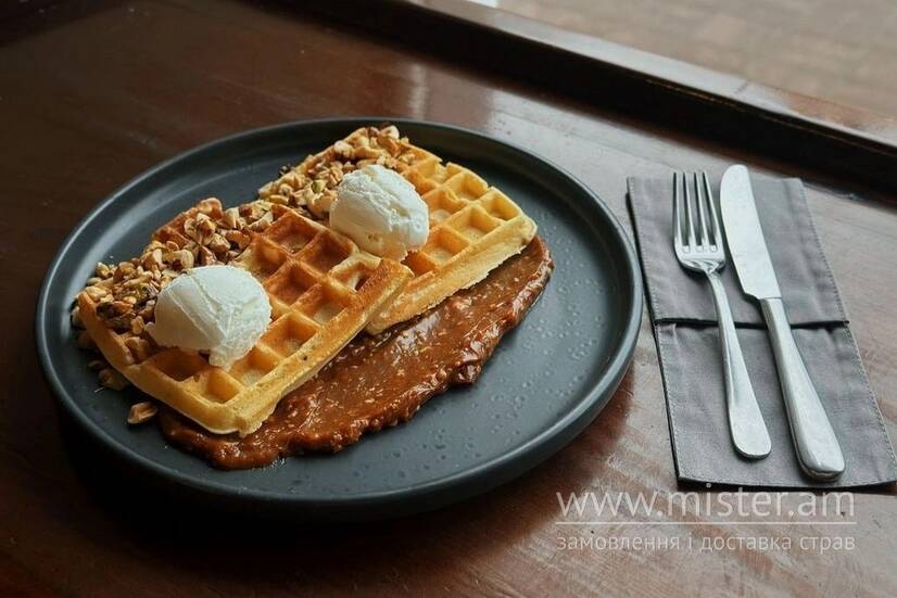 Ніжні бельгійські вафлі, подаються з карамельним соусом (цукрова карамель, вершки, вершкове масло, згущене варене молоко та смажений арахіс), асорті горіхів (арахіс, волоський горіх, фундук та фісташка) та ванільним морозивом.