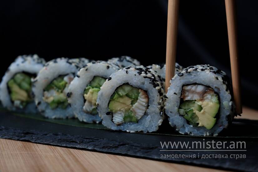 Рис, норі, лосось, вугор, огірок, сир філадельфія, соус унагі.