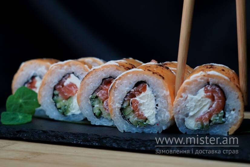 Рис, норі, лосось, огірок, сир філадельфія, сир чеддер.