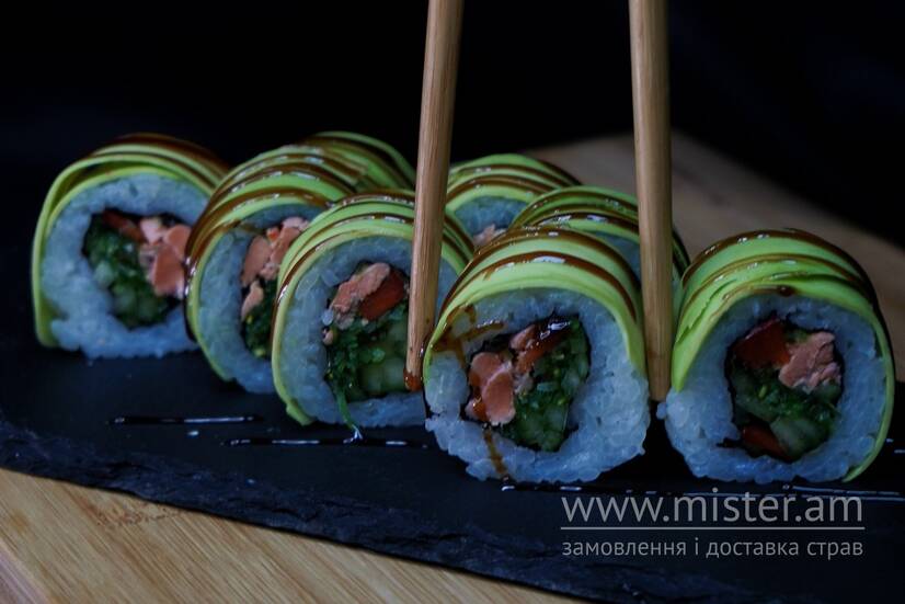 Рис, норі, вугор, обсмажений лосось, огірок, водорості чука, авокадо.