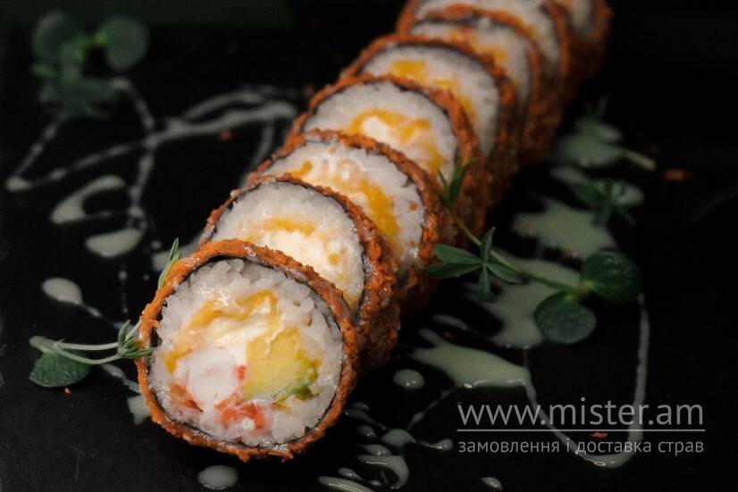 Рис, норі, сир чеддер, сир філадельфія, авокадо, ікра тобіко, креветка королівська, темпура, сухарі панко, соус солодкий васабі.