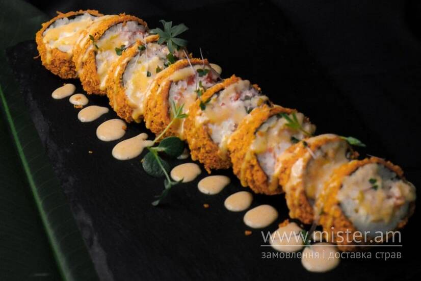 Рис, норі, сир чеддер, сир філадельфія, запечений лосось, огірок, ікра тобіка, соус спайс, темпура, сухарі панко.