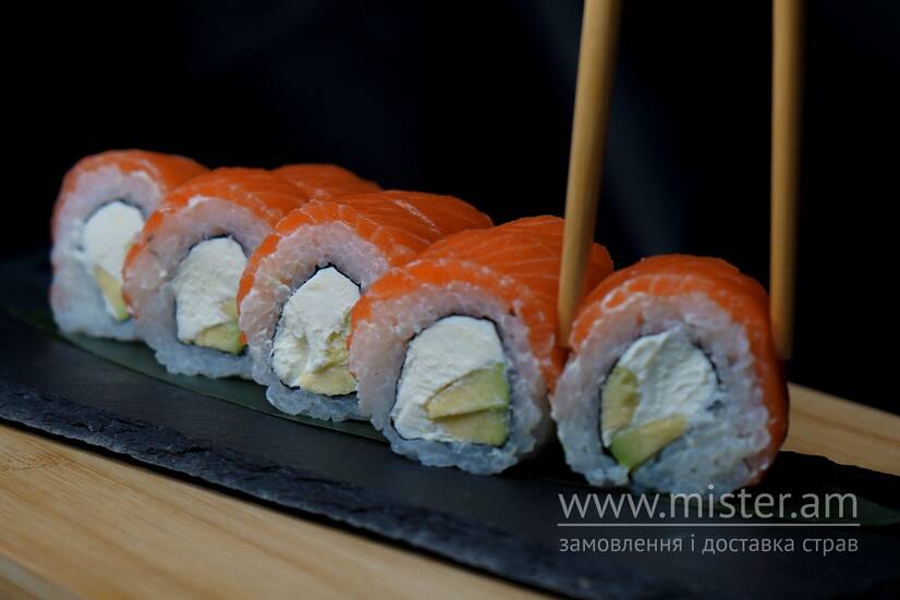 Рис, норі, лосось, авокадо, сир філадельфія.