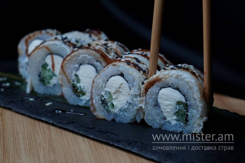 Рис, норі, вугор, огірок, сир філадельфія, кунжут, соус унагі.