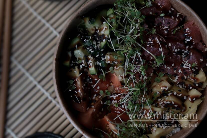 Рис, тунець, помідор чері, авокадо, кунжут, водорості чука, лимон/лайм, манго, грецький горіх, оливкова олія.