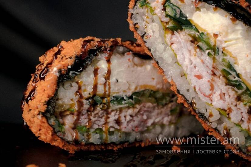 Рис, крабове м'ясо, соус теріякі, огірок, сир чеддер, сир філадельфія, норі, темпура, сухарі панко.