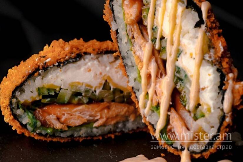 Рис, лосось запечений, гострий соус шрирача, огірок, сир чеддер, сир філадельфія, норі, темпура, сухарі панко, соус спайсі.