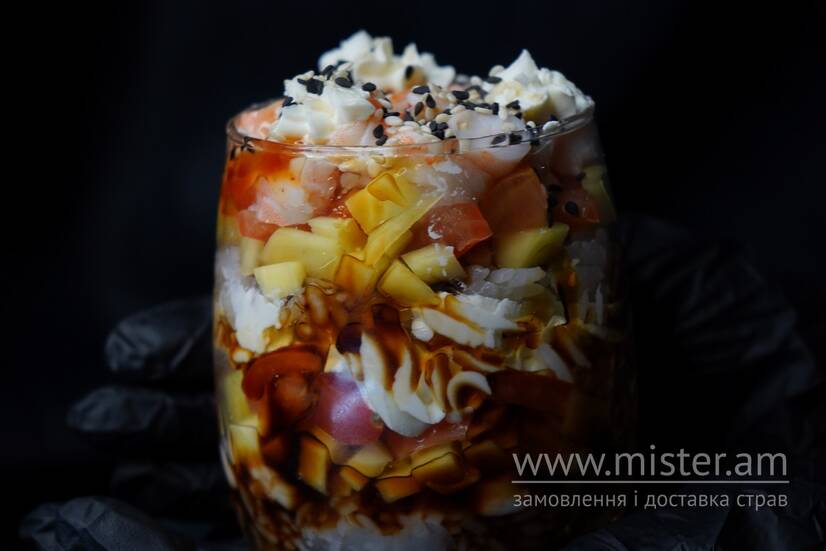 Рис, креветка, сир філадельфія, манго, помідори чері, авокадо, соус унагі.