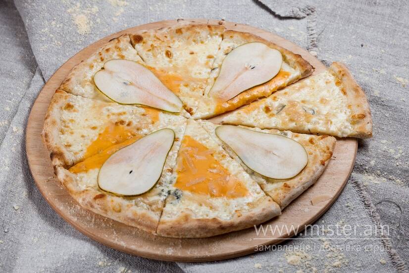 Соус вершковий, сир моцарела, сир дорблю, сир чеддер, сир пармезан, груша.