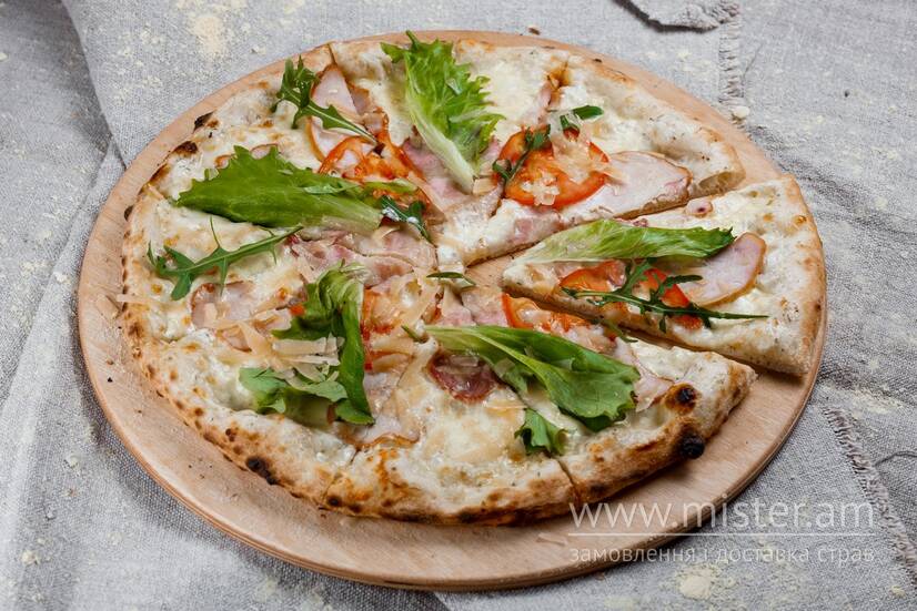 Соус цезар, сир моцарела, курка маринована, бекон, рукола, листя салату, томати свіжі, сир пармезан.