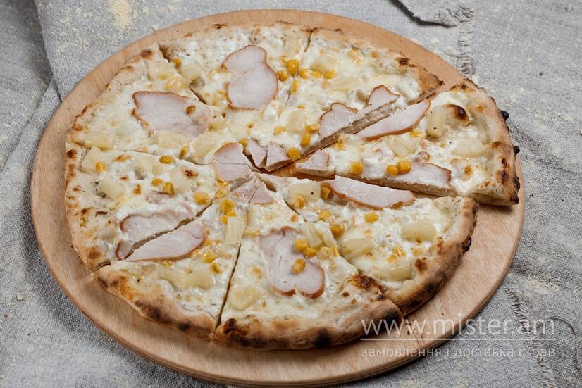 Соус часниковий, сир моцарела, курка маринована, кукурудза, ананаси.