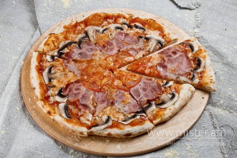 Соус томатний, сир моцарела, шинка польська, печериці, томати свіжі.