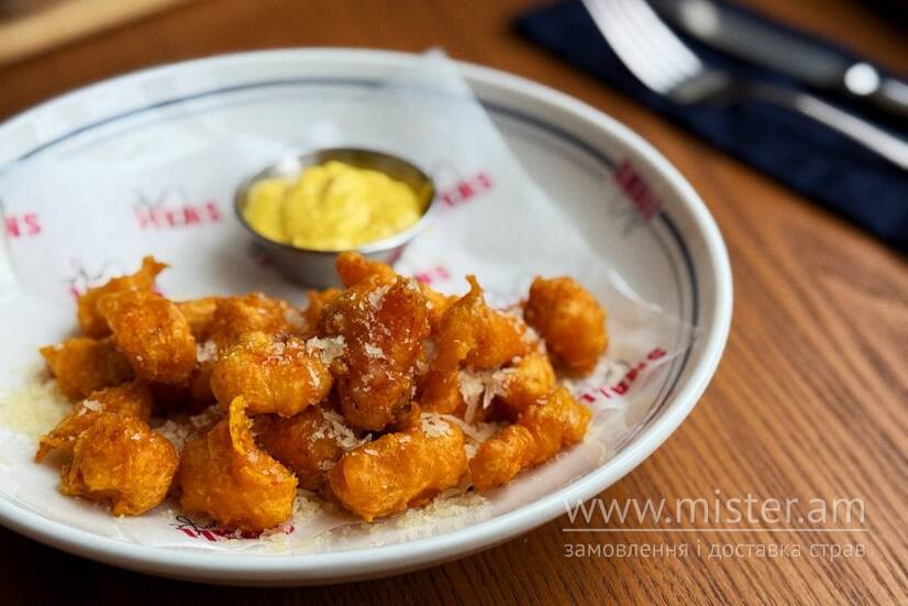 Маринована в соєвому соусі креветка, обсмажена в хрусткій темпурі у фритюрі, посипаємо паприкою, пармезаном і мікрогріном. Подається з соусом айолі-чіпотле.