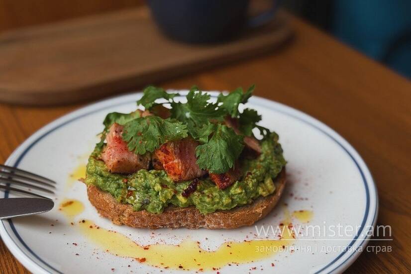 Тост, авокадо крем з додаванням васабі та солі тунець татакі в пластівцях чилі і паприці. Прикрашається кінзою, пластівцями чилі, оливковою олією та паприкою.