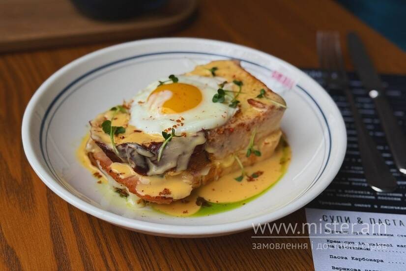 Запашний Бріош підсмажений в льєзоні та змащений соусом Бешамель, слайси шинки власного виробництва, огірок Піклс, сир моцарела, смажене яйце глазунья, паприка, цибуля фрі та сирний соус. Злегка поливаємо зеленою та оливковою олією, прикрашеємо мікрогріном.