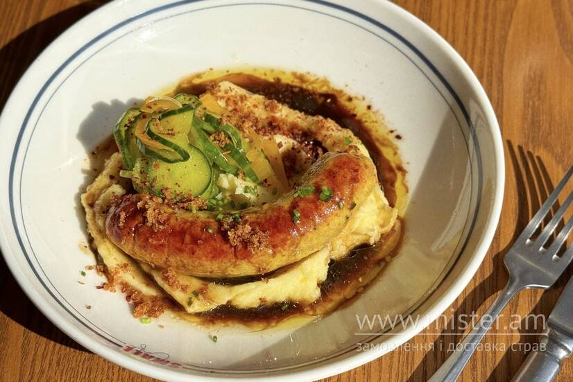 Ніжна сосиска з курячого стегна та картопляним пюре соус демігляс.