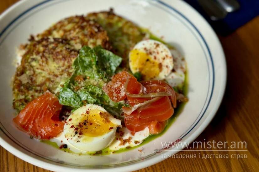 Оладки з кабачка, підкопчений грецький йогурт, мікс салату, слабосолений лосось та мʼяке яйце. Прикрашається цибулею фрі, паприкою, пармезан, поливається зеленою і оливковою оліями.
