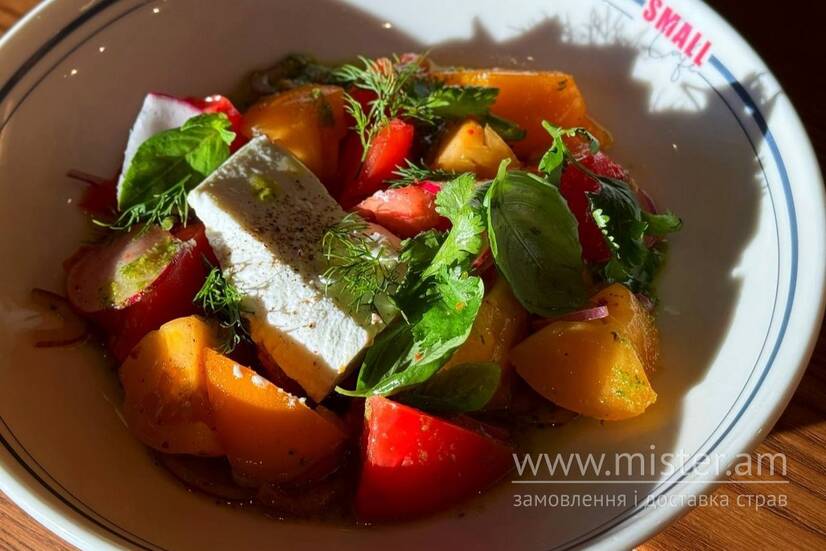 Стиглі томати, сир фета, свіжий редис, мікс зелені, цибуля марс, соус Песто. Поливаємо оливковою олією та подаємо з цільнозерновим хлібом.