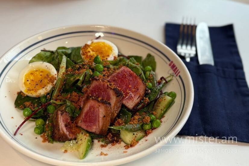 Мікс салату, бланшовані стручкова квасоля та зелений горошок, огірок, підсмажена картопля, тунець татакі. Подається з м'яким яйцем та заправлений діжонською заправкою, посипаєтья паприкою та цибулею фрі.
