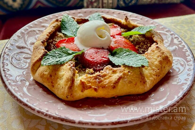 Карамелізовані яблука з корицею у хрусткому пісочному тісті, з додаванням сезоних ягід та морозива.