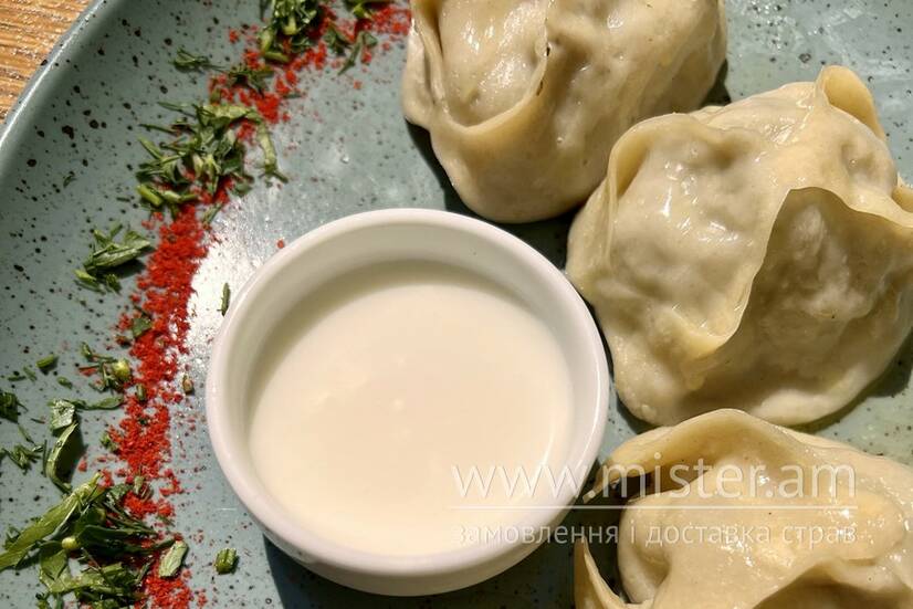 Домашні пельмені посипані волоським горіхом та политі топленим вершковим маслом, подаються з соусом хатих.