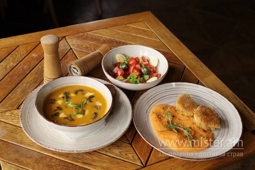 - Гарбузовий крем-суп з печерицями та бринзою - 200 г;