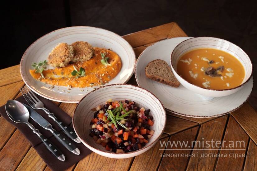 - Вінігрет - запечений буряк, картопля, морква, маринований огірок, маринована цибуля, заправляється пряною олією.