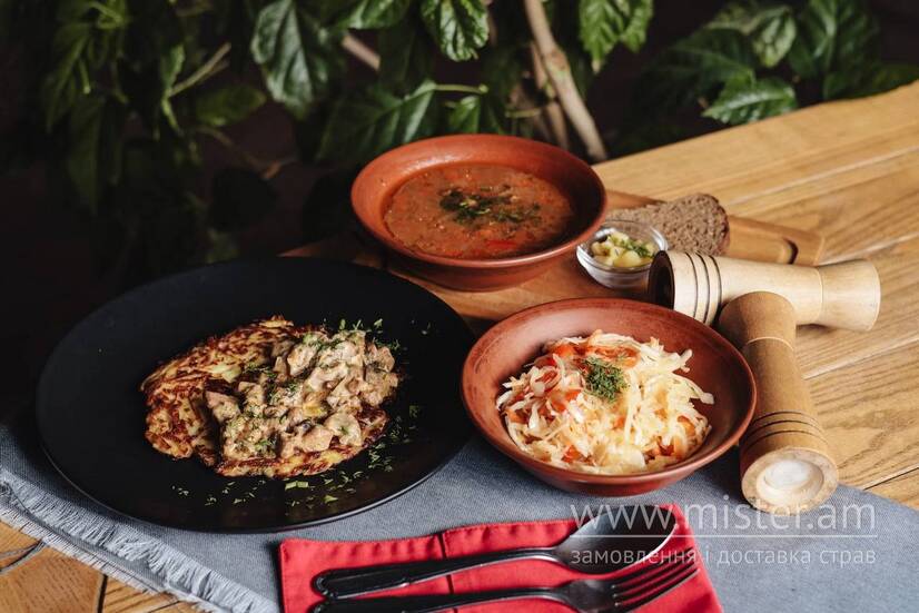 - Великий дерун з жульєном (картопляний дерун зверху обсмажене куряче м'ясо з печерицями та цибулею у сметані);