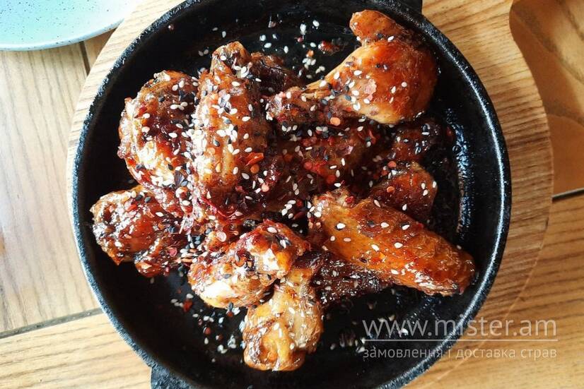 Крильця обсмажені в соево-медовому соусі з додаванням перцю, гірчиці та кунжута, подаеться з томатним соусом.