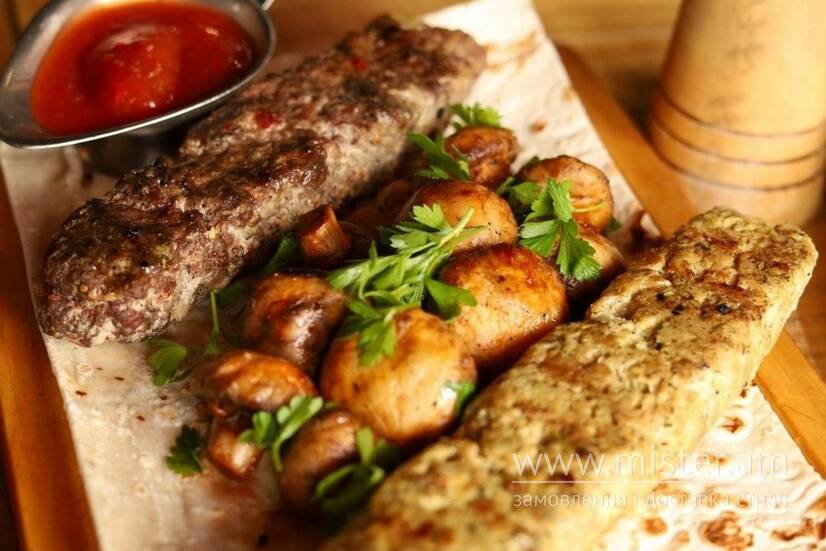 Люля-кебаб з курки, люля-кебаб з телятини, печериці гриль та томатний соус.