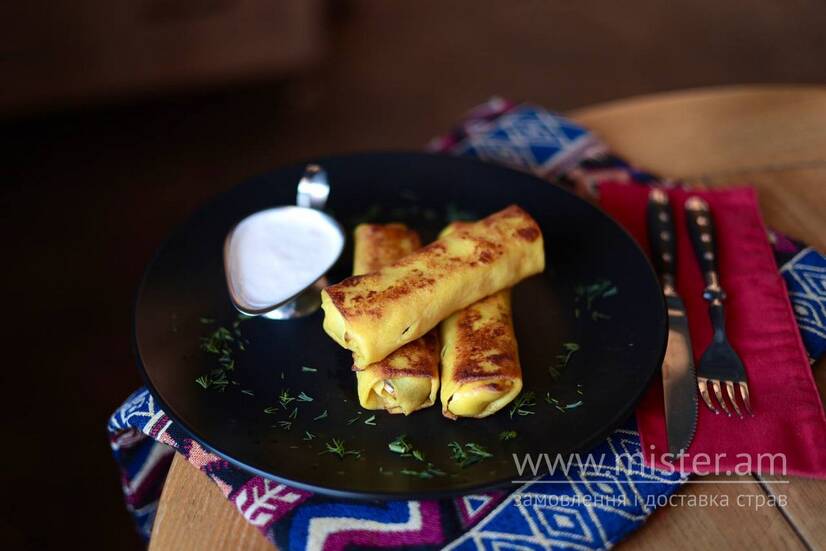 Домашні млинці з куркою, грибами та сиром сулугуні