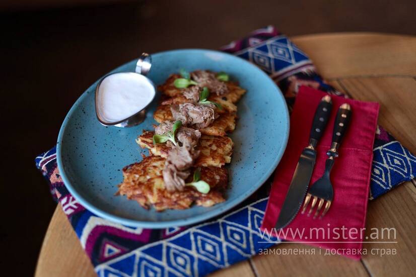 Софра Картопляні оладки з томленою бараниною та сметаною