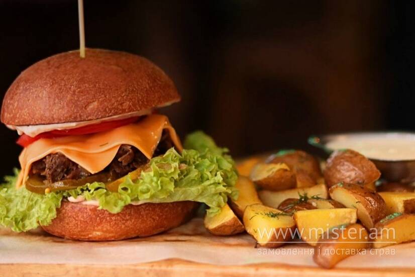 М'яка булочка з соковитою томленою бараниною, бургерним соусом власного виробництва, з сиром чеддер, помідором та маринованими огірочками, подається з картоплею по-селянськи та часниковим соусом.