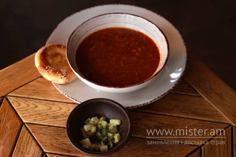Наваристий бульйон з бараниною та овочами, на основі томатів з додаванням спецій, подається з картоплею та фірмовим хлібом піте.