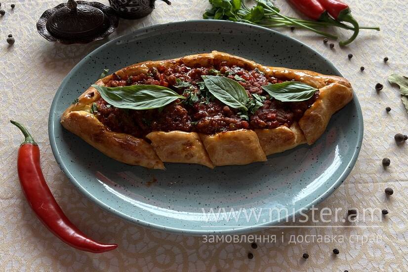 Традиційний корж з тіста з телятиною та овочами. Телятина, цибуля ріпчаста, перець болгарський, помідор, томатна та перцева паста.